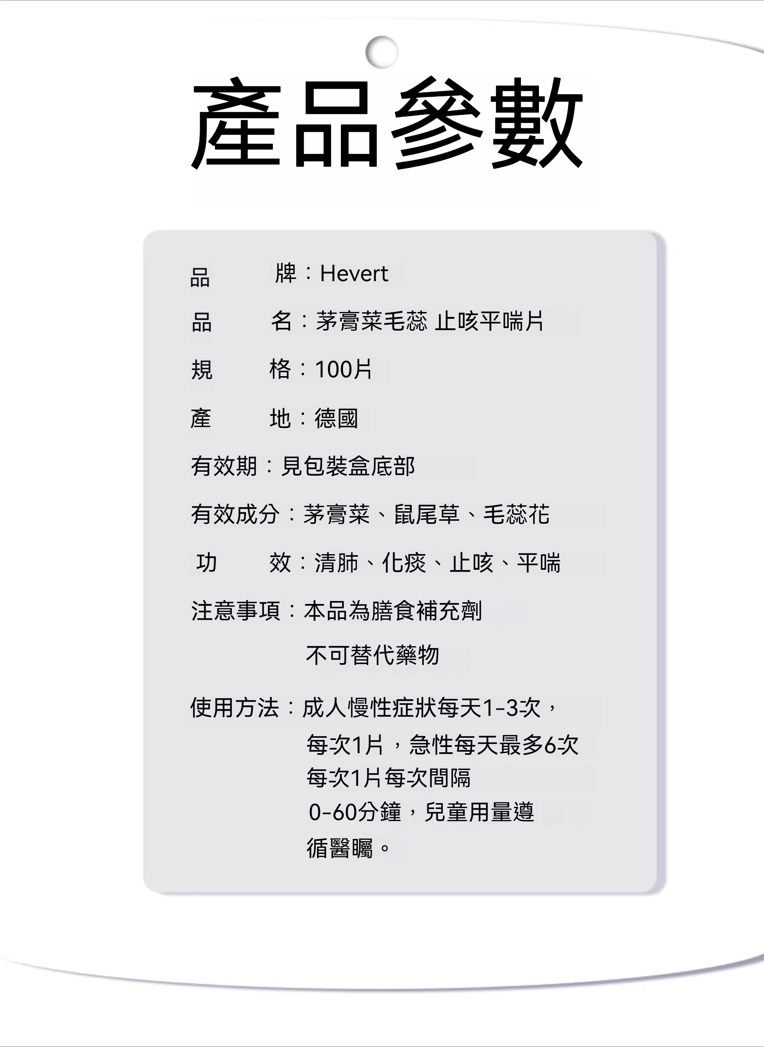 菲德Hevert 清肺支氣管喉嚨乾癢 咳嗽止咳化痰 咽喉痛咳嗽 特效藥 100粒