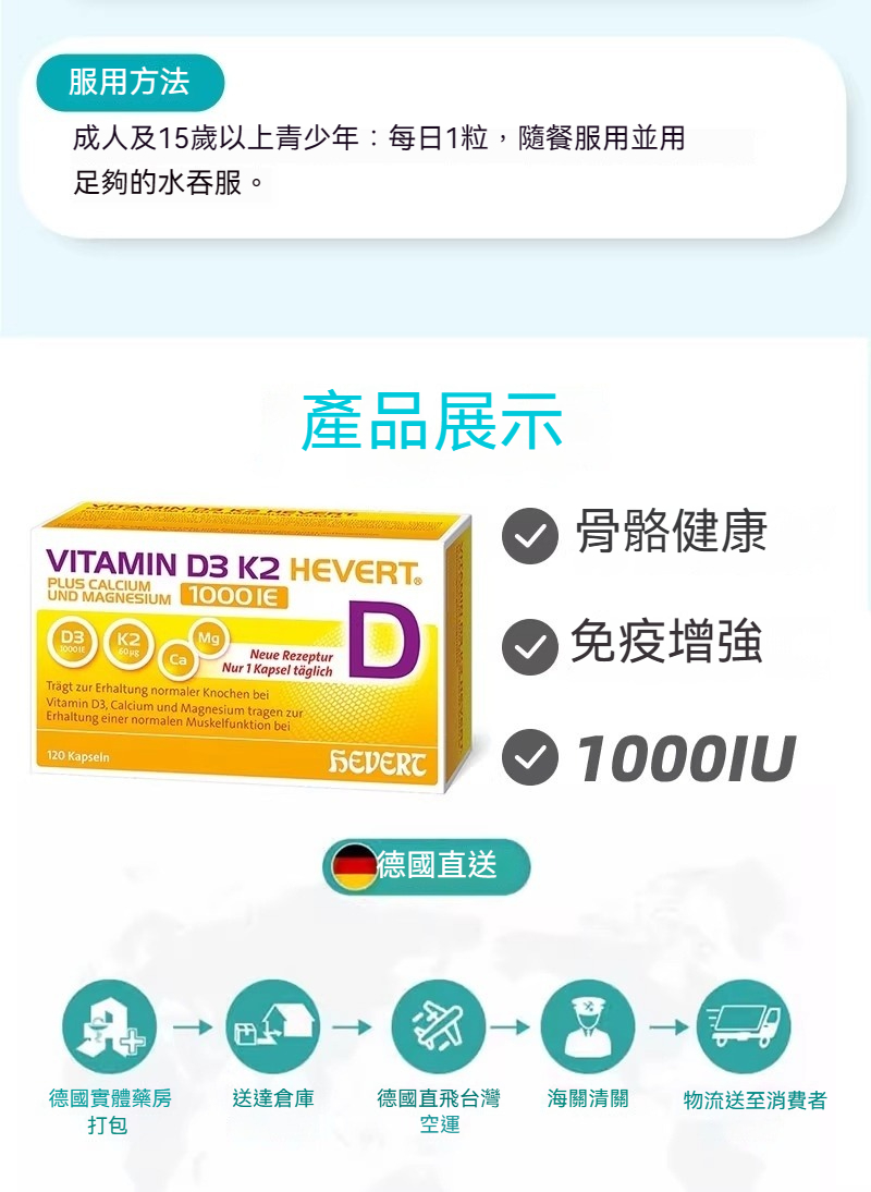 德國Hevert 菲德維生素D3K21000 Ie 加鈣鎂骨骼健康增強免疫 120粒