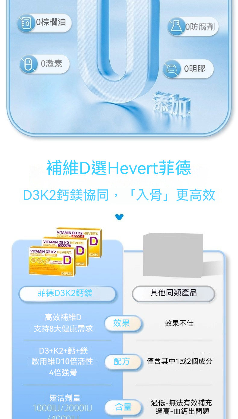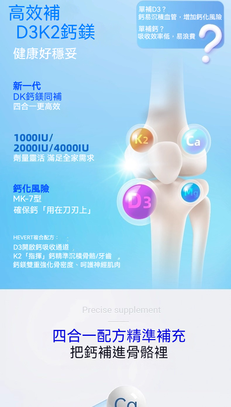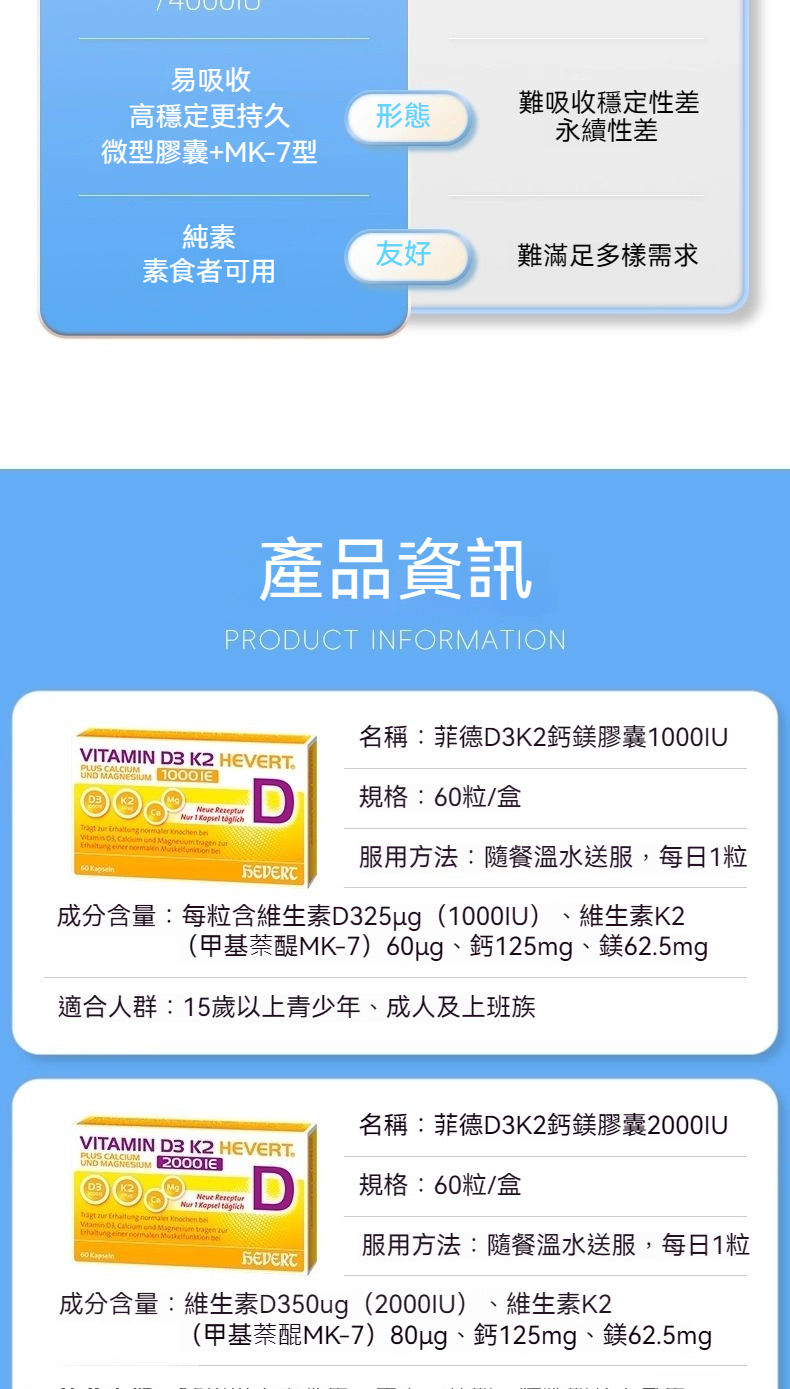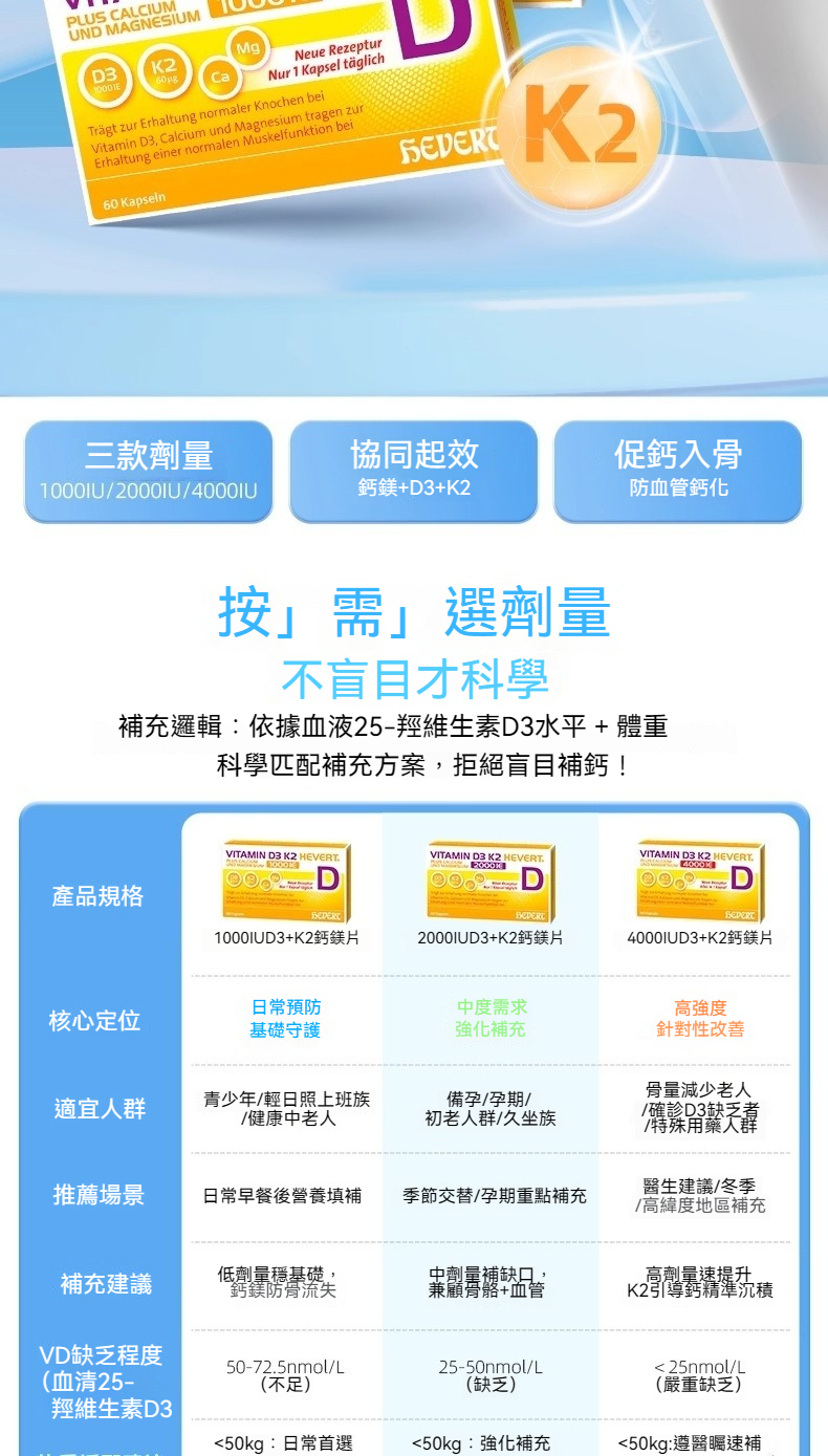 Hevert菲德 維生素D3K2鈣鎂共補1000/2000/4000IU 補充鈣強健肌肉骨骼片 60粒